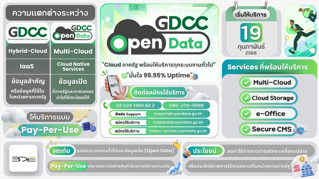 — ทั้งนี้ “GDCC Open Data” เป็นบริการคลาวด์กลางระดับ IaaS (Infrastructure as a Service) ที่มีความมั่นคงสูง โดยเป็นหนึ่งในบริการหลักของโครงการคลาวด์กลางภาครัฐ GDCC (Government Data Center and Cloud Service)